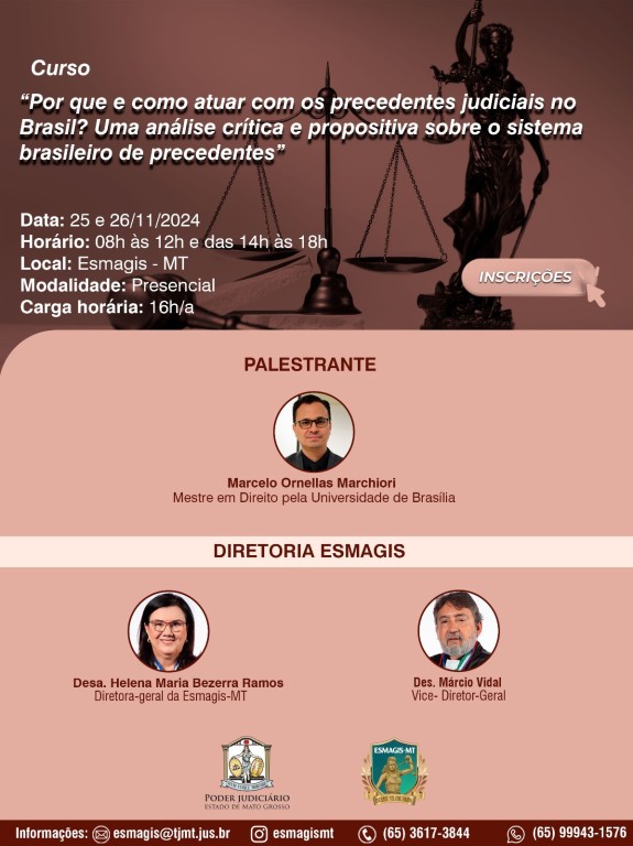 #ParaTodosVerem – Esta matéria possui recursos de texto alternativo para promover a inclusão das pessoas com deficiência visual. Imagem 1: banner colorido em tons de marrom e marsala onde está escrito o nome do curso – Por que e como atuar com os precedentes judiciais no Brasil? Uma análise crítica e propositiva sobre o sistema brasileiro de precedentes -, com data (25 e 26/11), horário (8h às 12h e 14h às 18h), local (Esmagis-MT), modalidade (presencial) e carga horária (16h/a). Abaixo, na parte central, uma foto do palestrante Marcelo Marchiori. Ele é um homem branco, de cabelos escuros e óculos de grau. Abaixo, a fotografia da diretora da Esmagis, desembargadora Helena Ramos, uma mulher branca, de cabelos escuros e óculos de grau. Já o vice-diretor, desembargador Márcio Vidal, é um homem branco, de cabelos escuros e barba grisalha. Assinam a peça os logos do Judiciário e Esmagis.