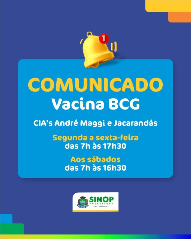 A Prefeitura de Sinop, por meio da Secretaria de Saúde, está trabalhando incansavelmente para garantir que as mamães e papais tenham acesso fácil e conveniente à vacina BCG, uma importante medida de prevenção contra a tuberculose em recém-nascidos. Para isso, os Centros Integrados de Atendimento André Maggi e Jacarandás estão prontos para receber os bebês de segunda a sexta-feira, das 7h30 às 17h30, e aos sábados, das 7h30 às 16h30.