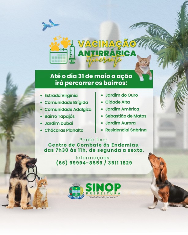 O Departamento de Endemias segue com a campanha de vacinação antirrábica itinerante pelos bairros e zona rural de Sinop. A ação da Secretaria de Saúde iniciada no mês de março, tem como meta imunizar mais de 24 mil animais, entre cães e gatos. Neste mês de maio a programação inicia pela Estrada Virgínia, Comunidade Brígida, Comunidade Adalgiza, Bairro Tapajós, Jardim Dubai, Chácaras Planalto, Jardim do Ouro, Cidade Alta, Jardim América, Sebastião de Matos, Jardim Aurora e Residencial Sabrina.