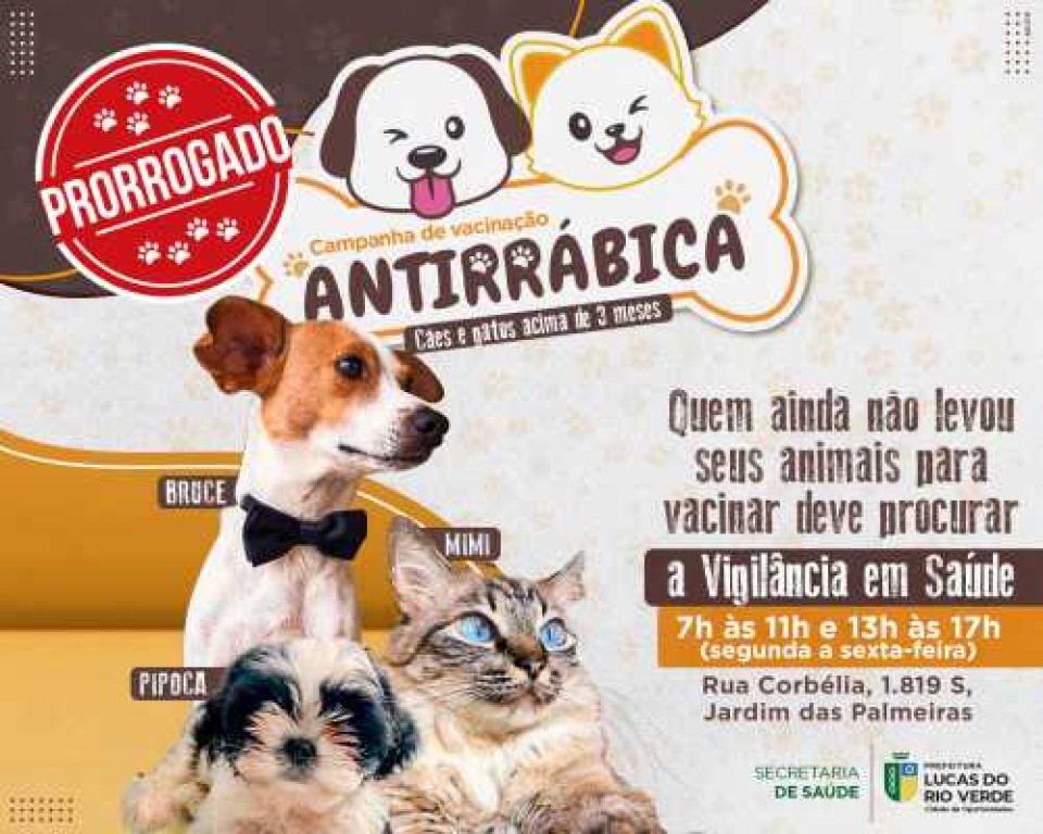 Para quem ainda não levou seu cão e/ou gato para vacinar contra a raiva, a Prefeitura de Lucas do Rio Verde anuncia que a imunização antirrábica foi prorrogada. Os interessados devem procurar a Vigilância em Saúde, de segunda a sexta-feira, das 7h às 11h e das 13h às 17h.