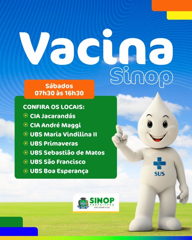 Neste sábado (18) e domingo (19), a Secretaria de Saúde, por meio do Setor de Imunização, segue com ação itinerante de vacinação. Das 14h às 20h, os atendimentos estarão concentrados no Shopping Center Sinop, próximo à loja C&A. Estarão disponíveis todas as vacinas inclusas no Plano Nacional de Imunização (PNI), inclusive a vacina contra a influenza.