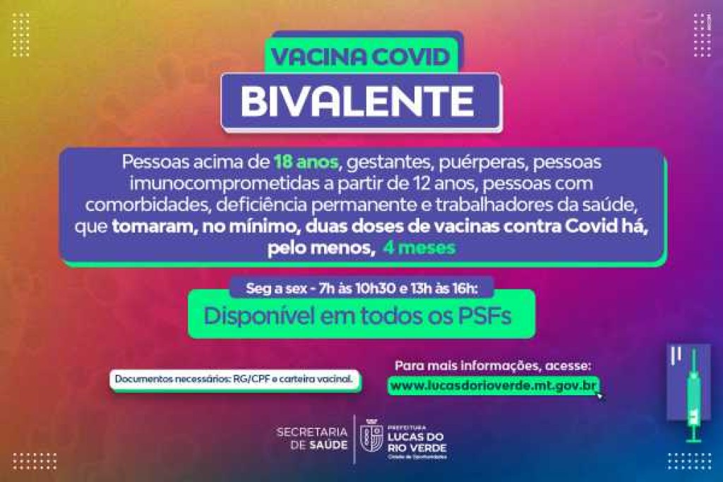 A Secretaria de Saúde de Lucas do Rio Verde liberou, na manhã desta terça-feira (25), mais uma etapa da campanha de vacinação contra a Covid-19. Nesta nova fase, todas as pessoas acima de 18 anos, gestantes, puérperas, pessoas imunocomprometidas a partir de 12 anos, pessoas com comorbidades, deficiência permanente e trabalhadores da saúde, que tomaram no mínimo, duas doses da vacina contra a Covid, há pelo menos 4 meses, serão vacinadas com o reforço do imunizante Bivalente da Pfizer.