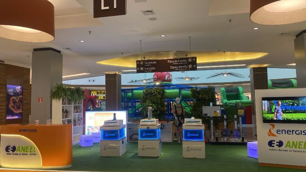 #Paratodosverem – Esta matéria possui recursos de texto alternativo para promover a inclusão das pessoas com deficiência visual. Descrição de imagem: foto horizontal colorida do estande da Energisa no shopping. À esquerda, há uma bancada branca e laranja escrito Energisa e ANEEL, ao centro há expositores com luzes azuis, estantes, puffs, além de aparelhos elétricos e um painel com um televisão à direita. Ao fundo há brinquedos do shopping e plantas.