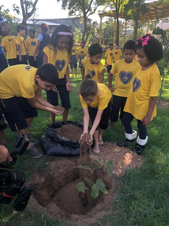 Esta matéria possui recursos de texto alternativo para promover a inclusão das pessoas com deficiência visual. Descrição da imagem 1: foto vertical, as crianças plantando uma muda de árvore no bosque da LBV. Imagem 2: foto horizontal, as crianças participando das brincadeiras do jogo rebojando, sentadas em círculo, e uma aluna em pé com o dado do jogo em mãos, e ao centro, o palhaço palhaço Lelé Picolé Curimpampam, criado pelo Segundo Sargento, Marcelo Luciano Pereira que atua no Juvam. Imagem 3: foto horizontal, os alunos posicionados em forma de círculo, de mãos dadas, ouvindo as orientações da engenheira florestal do projeto, que está ao centro do bosque do Centro Comunitário. Imagem 4: foto horizontal- os alunos estão sentados em cadeiras brancas, no auditório do Centro Comunitário da LBV, ouvindo a palestra da engenheira florestal que está de pé na frente deles.