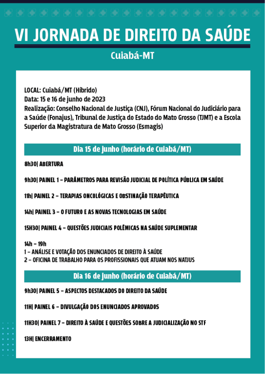 Esta matéria possui recursos de texto alternativo para promover a inclusão das pessoas com deficiência visual. Descrição da imagem: arte publicitária colorida. Texto VI Jornada de Direito da Saúde. Cuiabá-MT. Abaixo programação.
