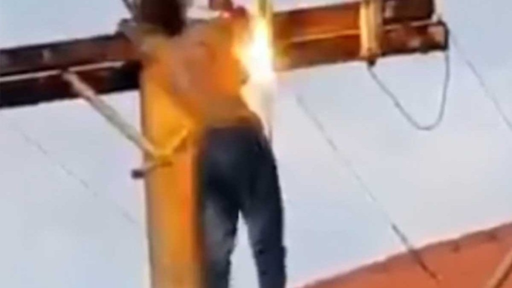 Um homem, aparentemente alcoolizado, tomou um choque e caiu de uma altura de cerca de cinco metros após subir em um poste de energia e tentar se equilibrar sobre os fios de alta tensão. O acidente foi registrado na manhã de sábado (3), em Guarapari, Região Metropolitana de Vitória. Veja o vídeo abaixo.