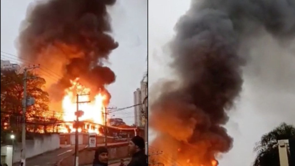 Imagens compartilhadas nas redes sociais mostram o fogo tomando conta do estabelecimento e uma coluna de fumaça preta subindo conforme o incêndio se alastrava.