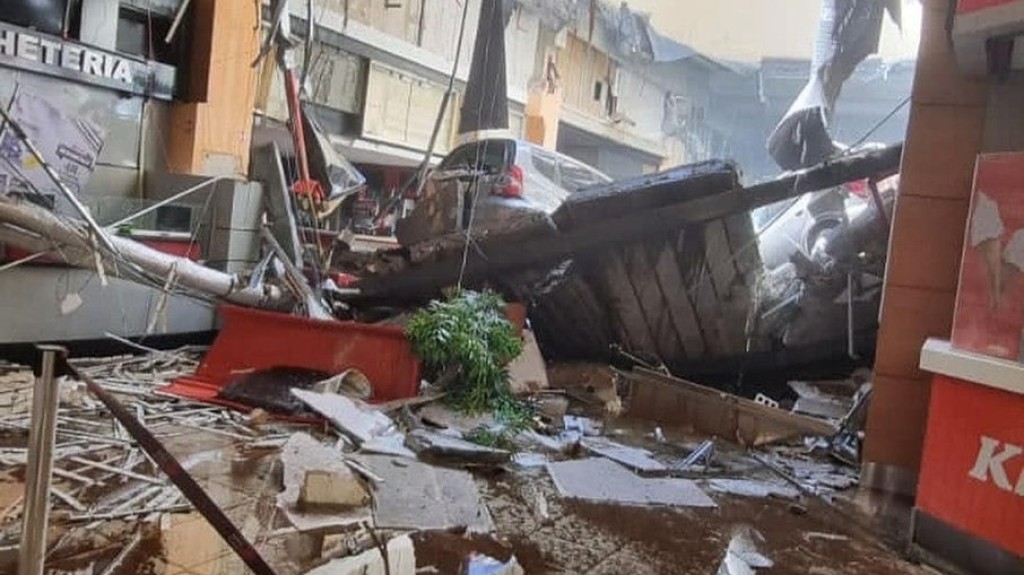 Segundo testemunhas, a estrutura caiu sobre a praça de alimentação. Veículos estacionados também foram abaixo com o desabamento.