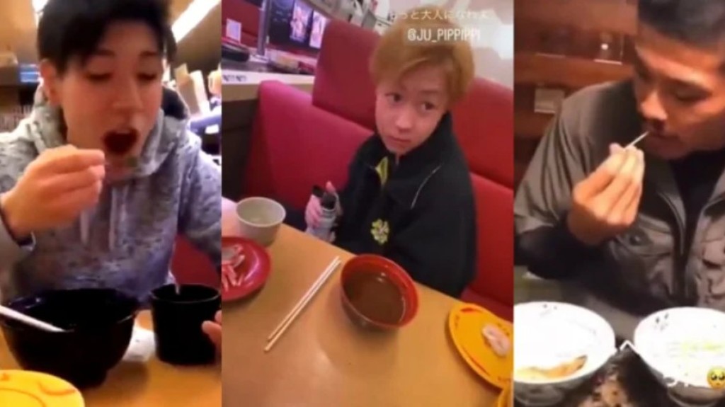 Um dos vídeos mostra um dos integrantes do trio tirando um pedaço de sushi de um prato e colocando inteiro na boca, logo depois, ele bebe molho de soja diretamente da garrafa que é dividida pelos clientes.