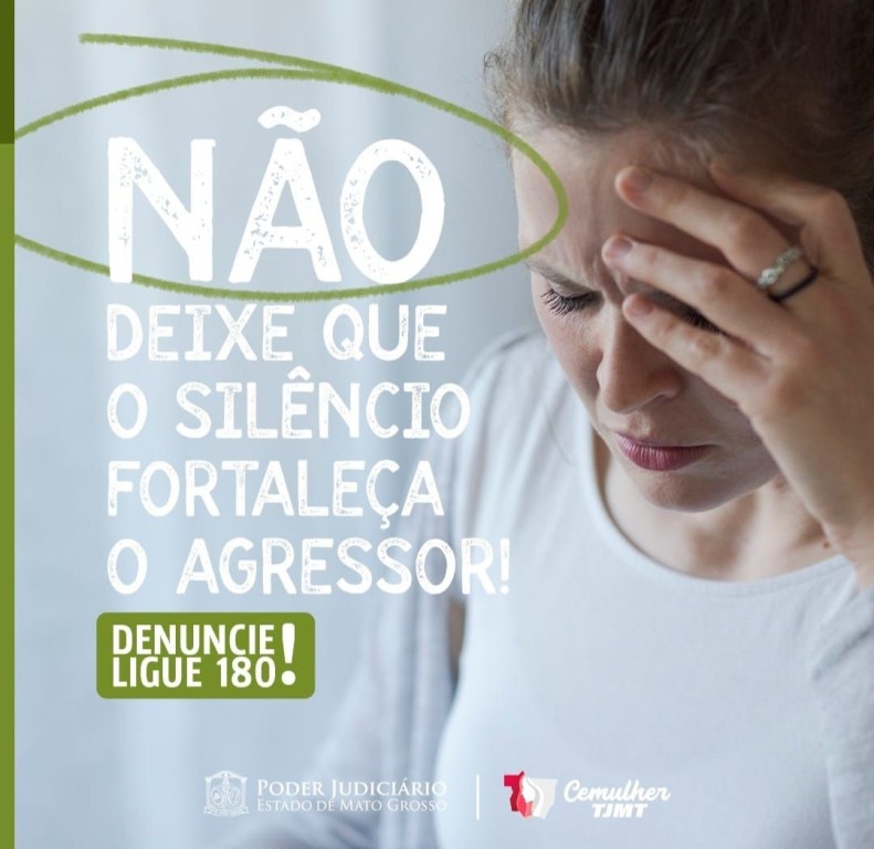 #Paratodosverem. Esta matéria possui recursos de texto alternativo para promover a inclusão de pessoas com deficiência visual. Foto 01: Arte contendo a frase: “Não deixe que o silêncio fortaleça o agressor!” em caixa alta. No terço direito, há uma mulher em close up, de cabeça baixa e mãos na testa, ela aparenta estar muito triste. Logo abaixo está escrito “Denuncie! Ligue 180!”, no rodapé estão as logomarcas de Poder Judiciário e da Cemulher TJMT.