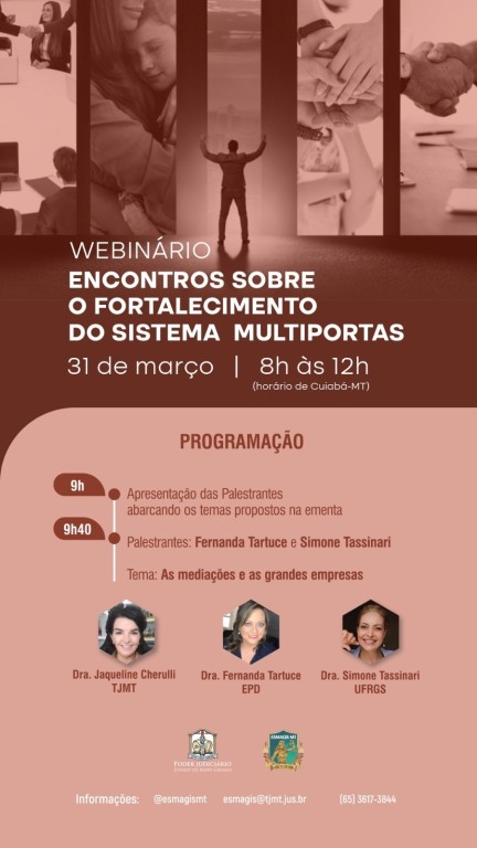 A Escola Superior da Magistratura de Mato Grosso (Esmagis-MT) realiza, na próxima sexta-feira (31 de março), o webinário “As grandes empresas e as mediações”. A capacitação é voltada a magistrados(as), servidores(as), assessores(as), estagiários(as), terceirizados(as), membros do Sistema de Justiça e equipes multidisciplinares.