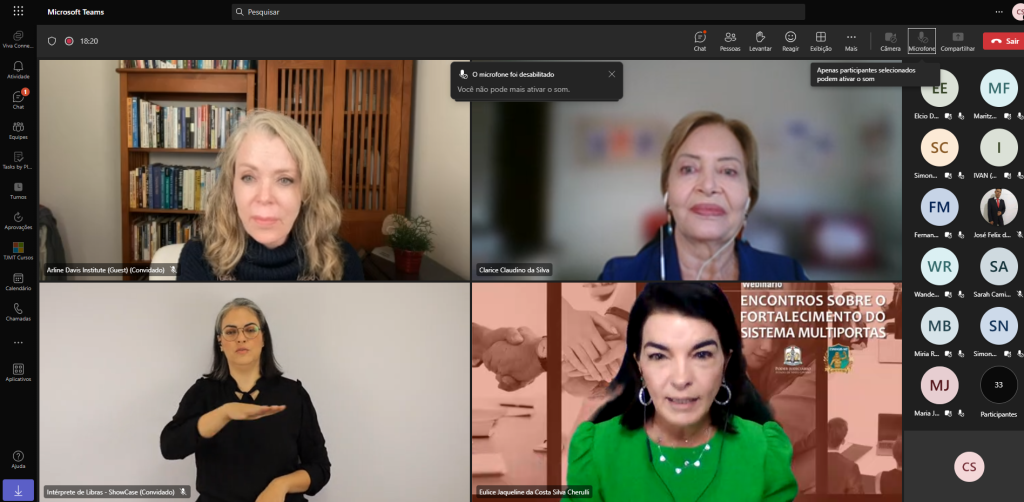 #Paratodosverem. Esta matéria possui recursos de texto alternativo para promover a inclusão das pessoas com deficiência visual. Descrição da imagem: Captura de tela que mostra o webinário. Em destaque, aparecem, em sentido horário, as telas da desembargadora Clarice Claudino da Silva, da juiz Jaqueline Cherulli, da mediadora Michelle Donegá e da especialista em Programação Neurolinguística e Mindfulness Integrado, Arline Davis. No canto direito, aparecem as telas dos demais participantes em tamanho menor.